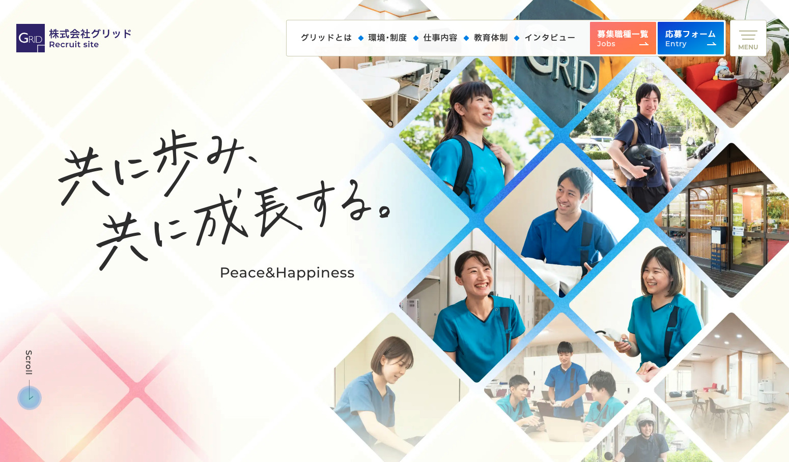 株式会社グリッド様の中途採用サイトです。社名にちなんだ「網目」模様を取り入れたデザインが印象的なサイトです。スタッフの方々の写真を多く使用することで、現場の雰囲気や人の温かさが伝わり、安心感のある世界観が丁寧に表現されています。