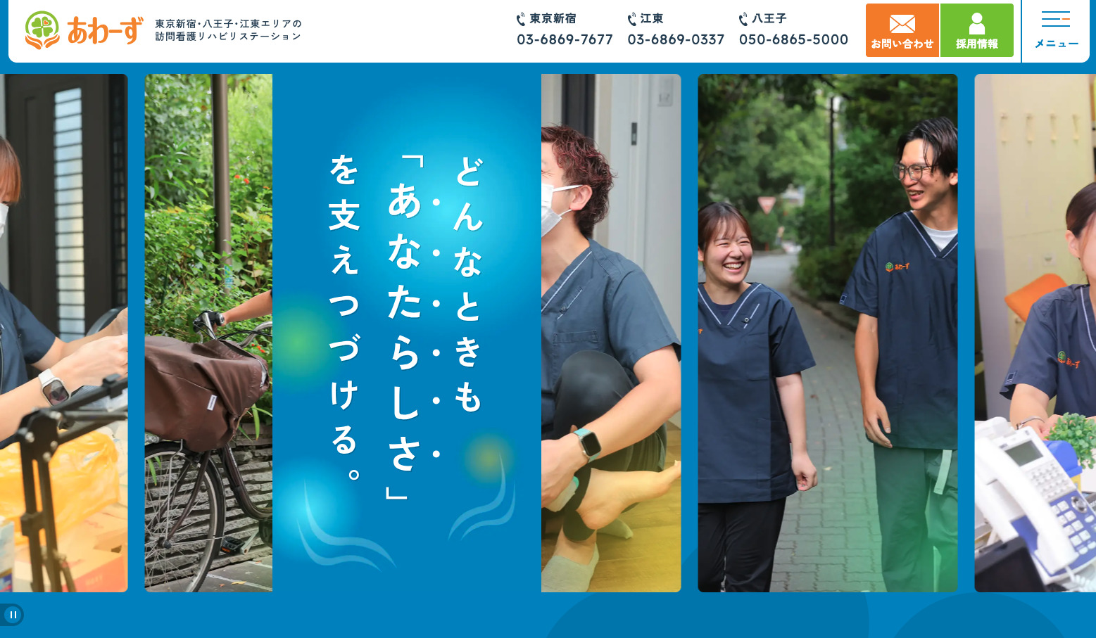 海を想起させる、青のグラデーションが印象的なホームページです。訪問看護ステーションのホームページとしては珍しく、スタイリッシュな印象のデザインです。どちらかというと男性よりのデザインテイストといえます。