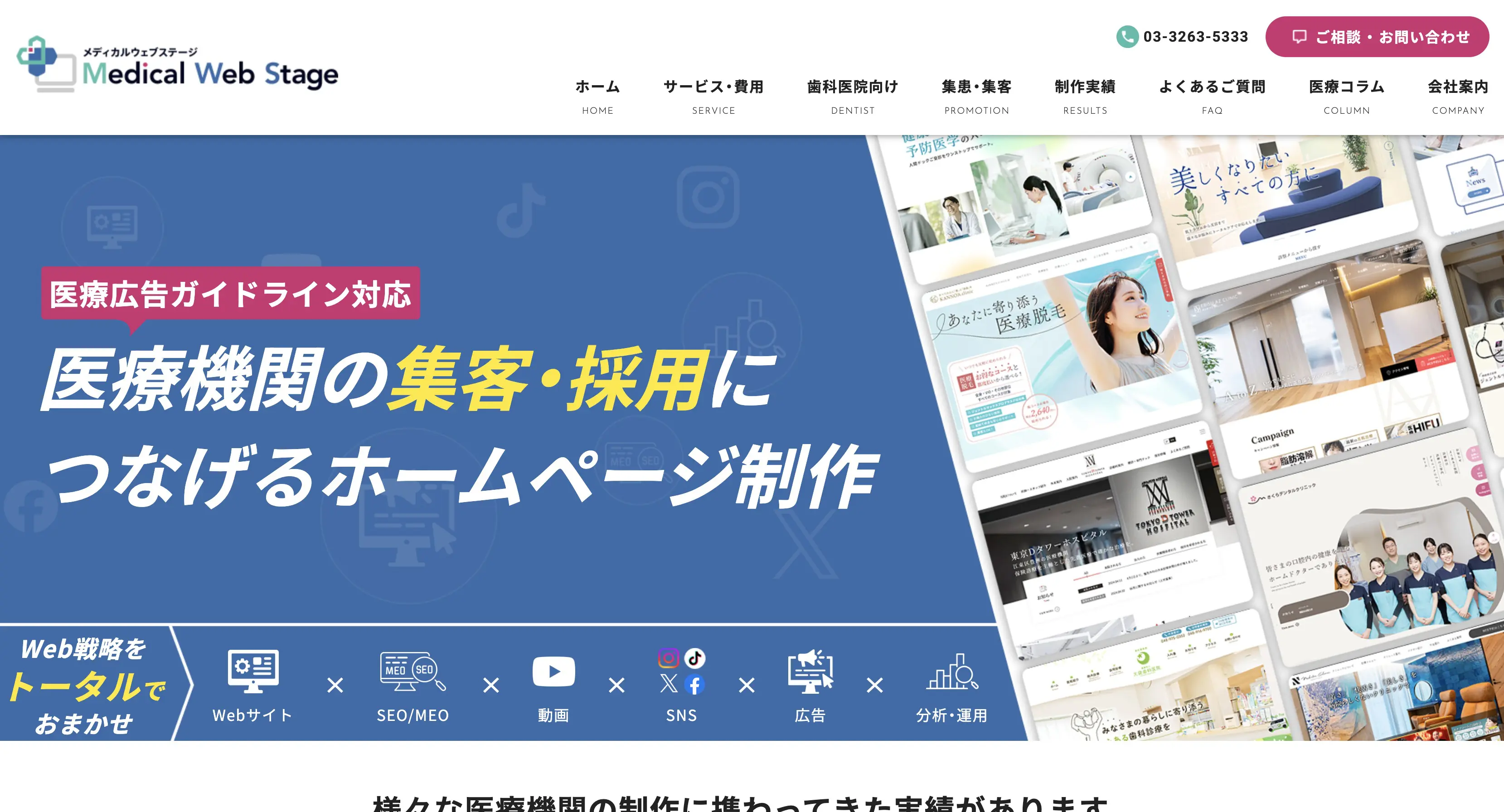 メディカルウェブステージは集患・採用に強いホームページ制作及びWebコンサルティング事業を展開する株式会社WEB STAGEが運営する医療業界向けにWebサービスを提供する事業です。