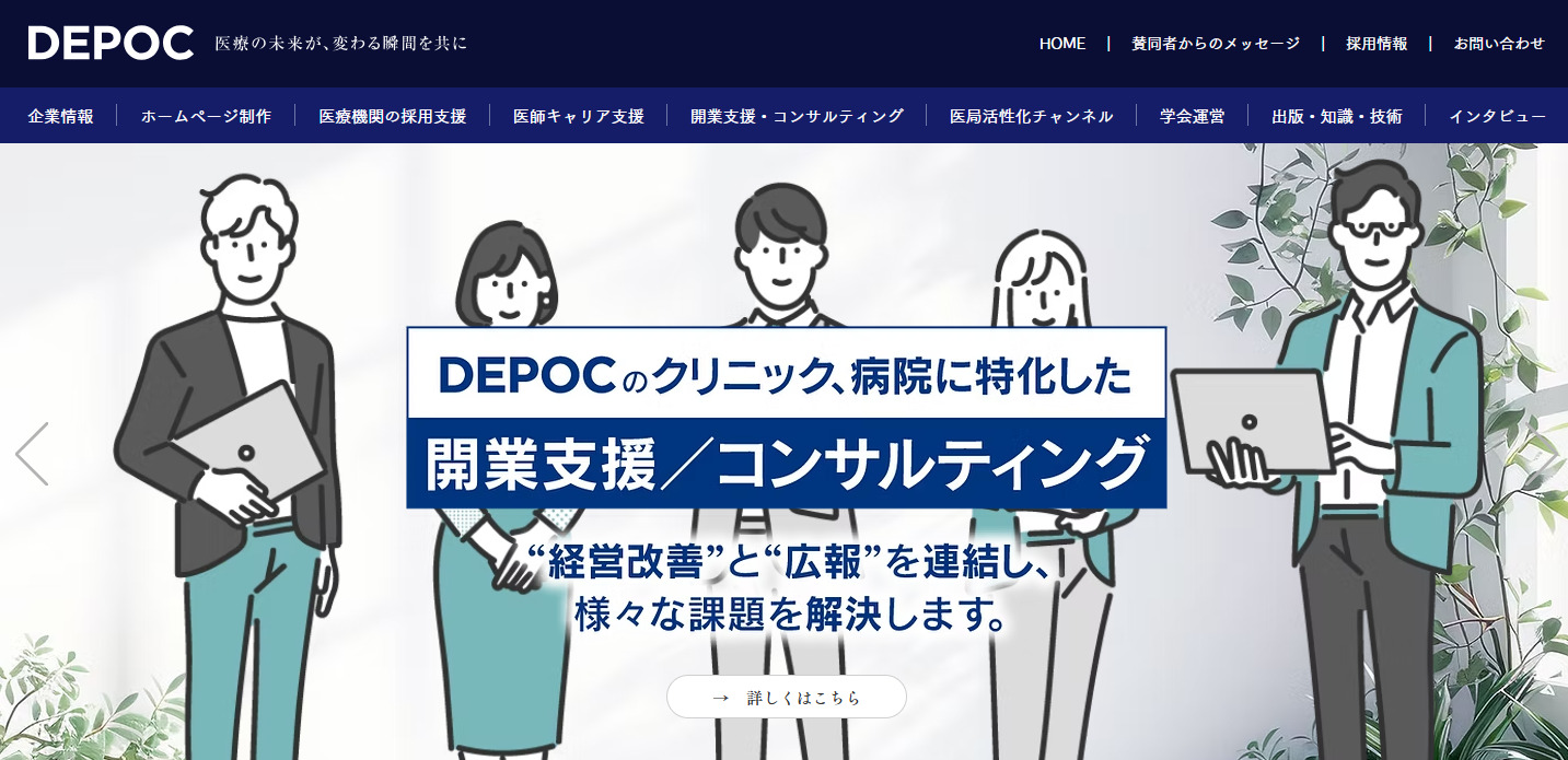 株式会社DEPOC(デポック)は、病院・クリニックに特化したWeb制作を強みとする制作会社です。大学病院から一般病院、クリニックまで全国の医療機関のサイト制作を手がけ、集患や採用効果を意識した情報設計・デザインを強みとしています。オリジナル文章や高精細な写真・動画を活用し、院内の雰囲気やスタッフの人柄まで伝える表現力が特徴です。SEO対策にも強く、開業初期の集患支援から長期的な成長支援まで幅広く対応しています。