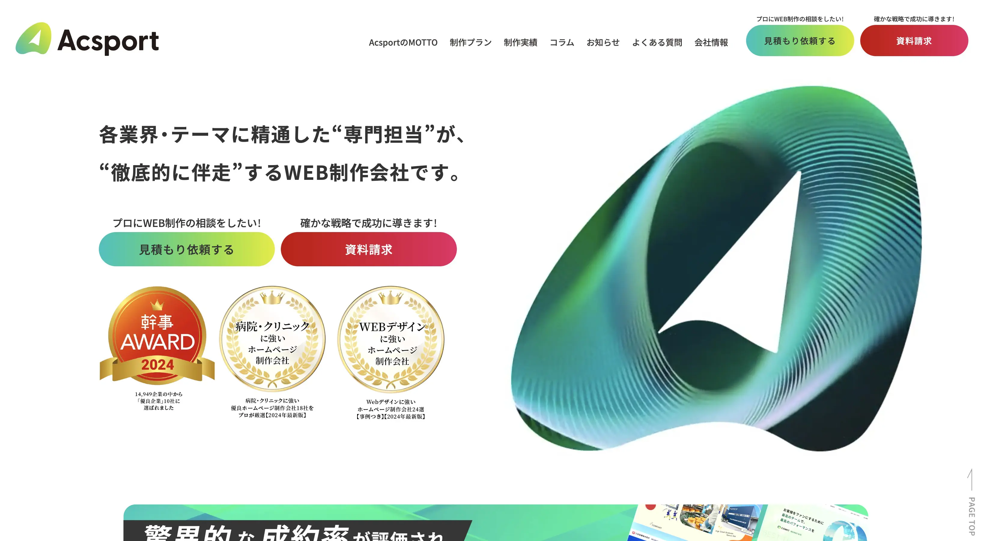 株式会社Acsport(アクスポート)は、東京都千代田区に本社を構えるWeb制作会社で、名古屋、広島、富山にもオフィスを展開しています。大手コンサルティング会社や事業会社で長年にわたり経営コンサルティングを行ってきたコンサルタント集団による、「売上アップ=集患」にコミットするWebサイト制作を手掛けています。各クリニックや病院の特徴や強みを最大限に引き出し、患者さんにとって使いやすく、信頼性の高いサイトを構築することに注力しています。