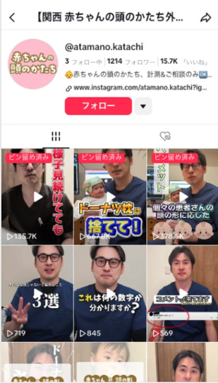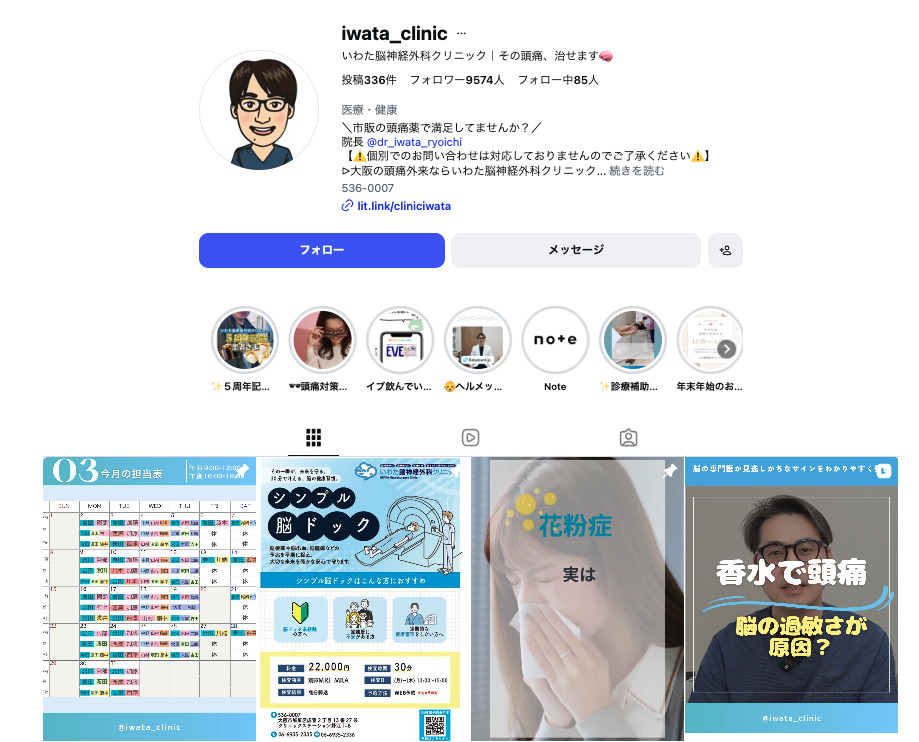 いわた脳神経外科クリニック様は、InstagramやTikTokを活用し、頭痛に関する豆知識や専門医の知見を発信しています。医院公式アカウントに加え、赤ちゃんの頭のかたち外来に特化した専門アカウントも運用している点が特徴です。