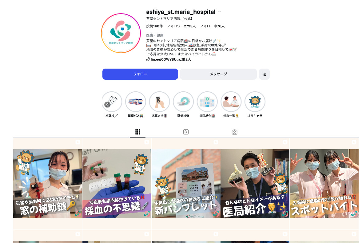 芦屋セントマリア病院様は、Instagramを活用し、院内の様子や仕事内容を発信しています。スタッフが出演することで職場の雰囲気が伝わりやすく、公式LINEアカウントへの応募導線も整えられている事例です。