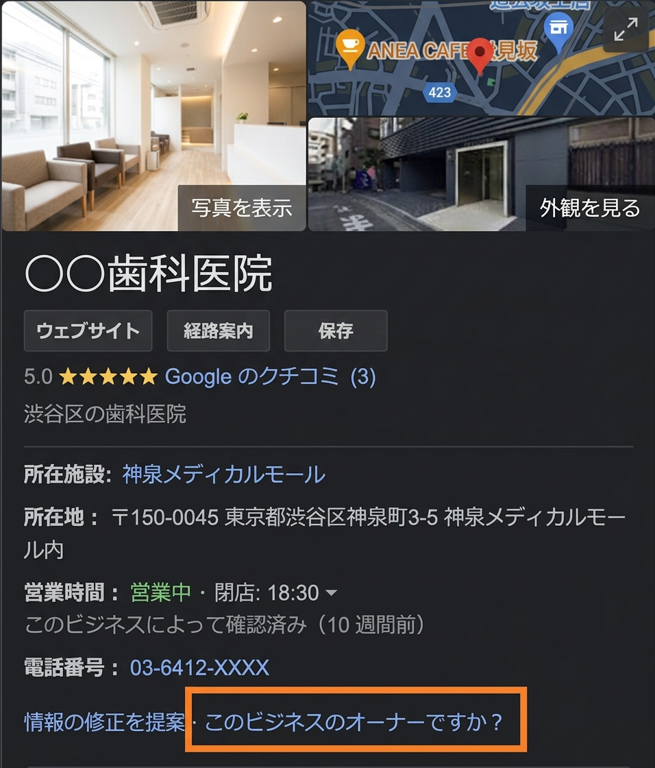 ナレッジパネルの下部に「このビジネスのオーナーですか?」というリンクがある場合、まだ誰も自院の情報を管理していない状態です。