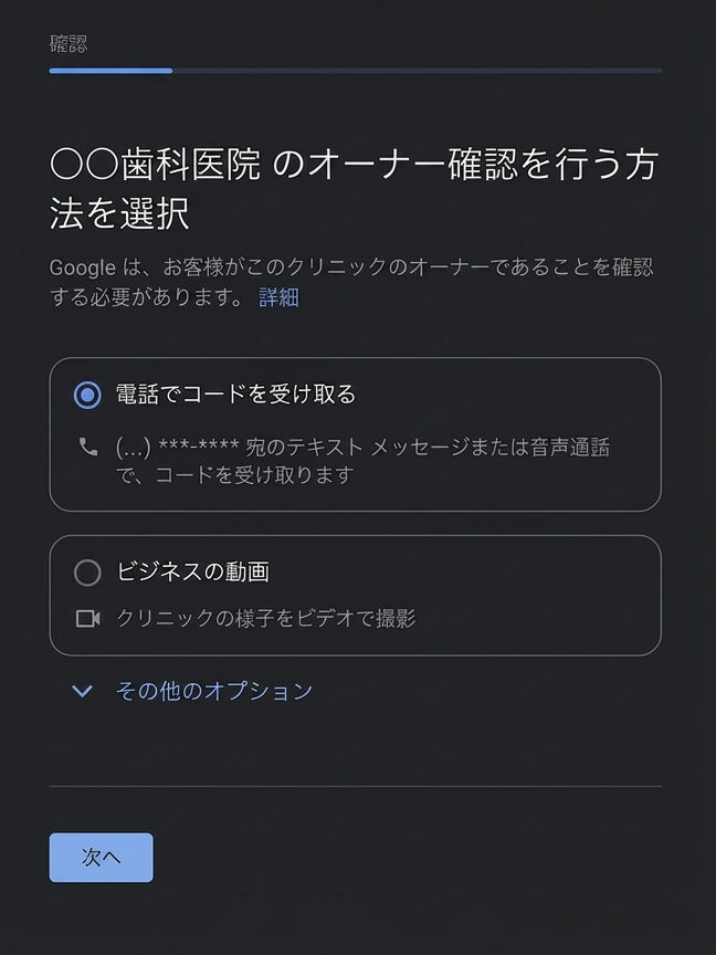 次の画面で、オーナー確認を行う方法を選択します。任意の方法を選択するとGoogleから確認コードが送られます。これを正しく入力することで「オーナー確認」を行うことができます。