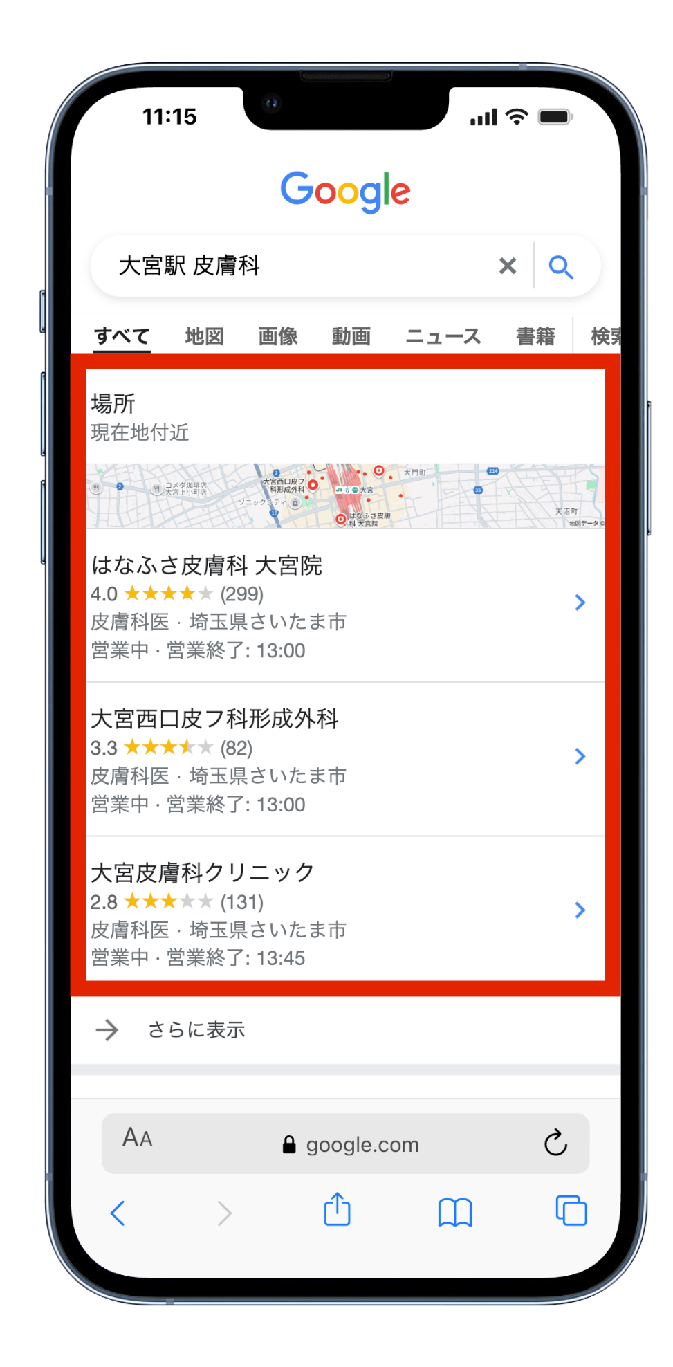 こちらは、スマートフォンで「大宮駅 皮膚科」と検索した際の検索結果画面です。