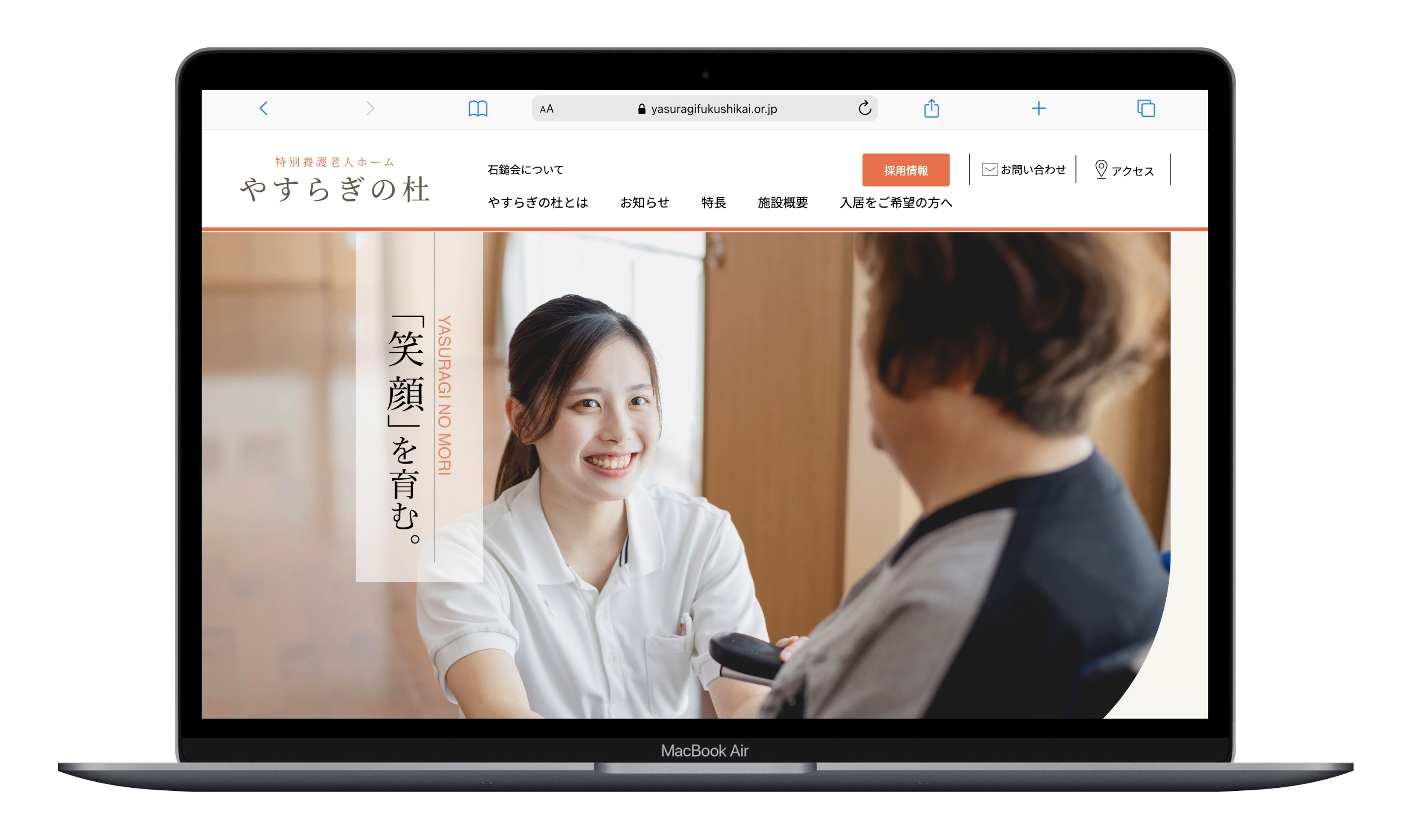 職員の写真や施設内の様子が多く掲載されており、やさしい雰囲気が伝わるサイトです。