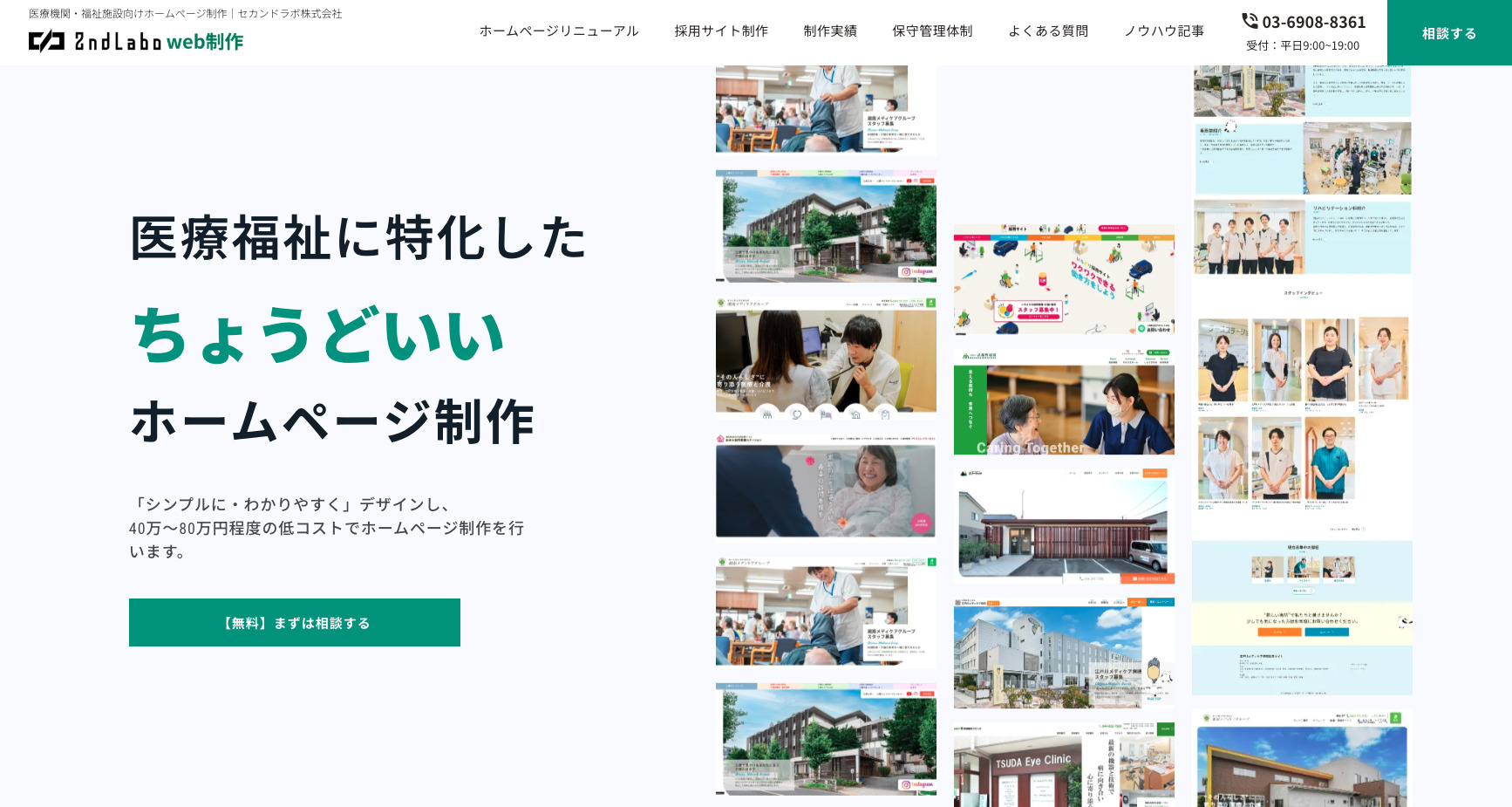 セカンドラボ株式会社では、病院・クリニックに特化したホームページ制作を、40万~80万円の低コストで提供しています。奇抜さよりも「信頼性」「安心感」を重視した、シンプルで分かりやすい「ちょうどいい」デザインが特徴です。