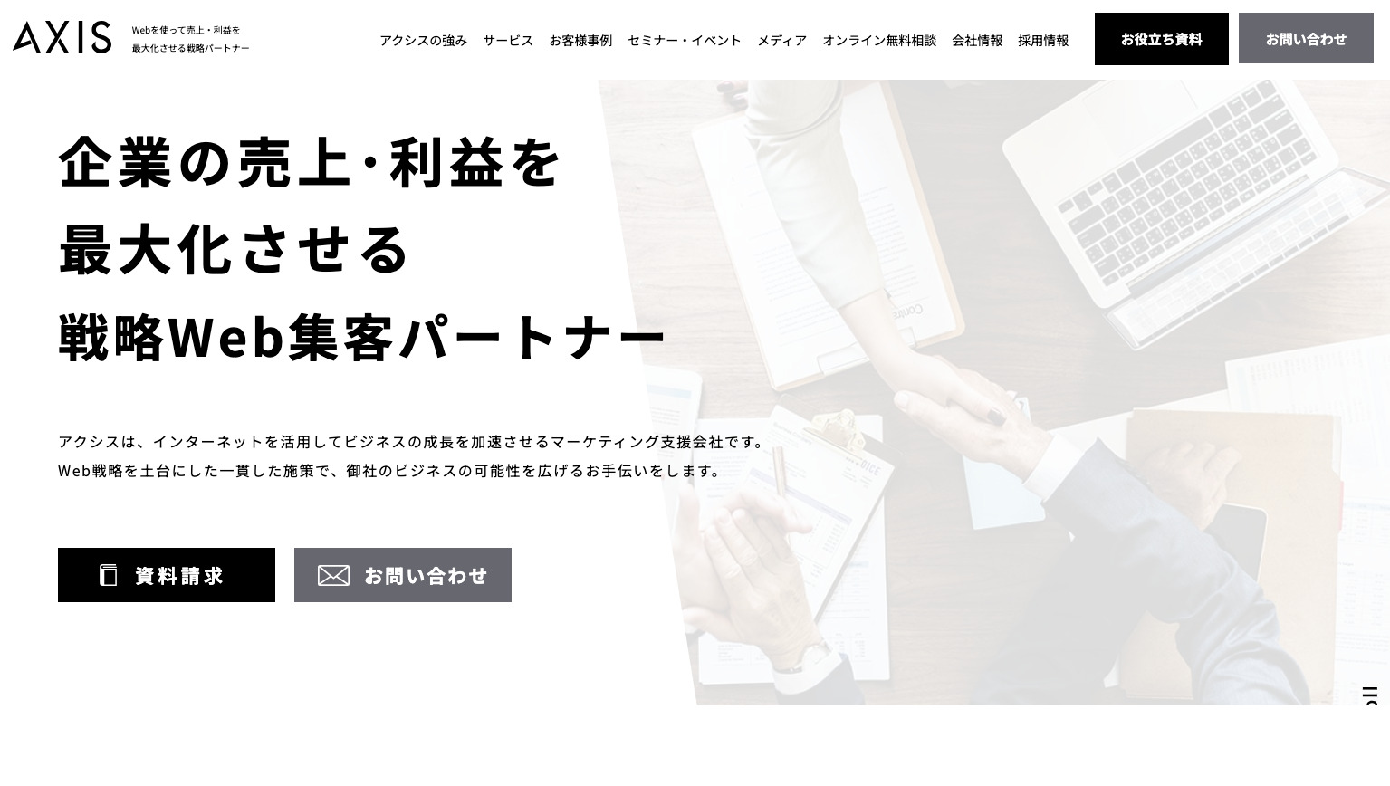 株式会社アクシスは、岐阜県岐阜市に本社、東京にオフィスを構えるWebマーケティングの専門会社です。「企業の可能性をインターネットで最大化する」をミッションに、集客・採用・コスト削減につながる戦略的施策を提案・代行し、企業の売上・利益向上をサポートします。