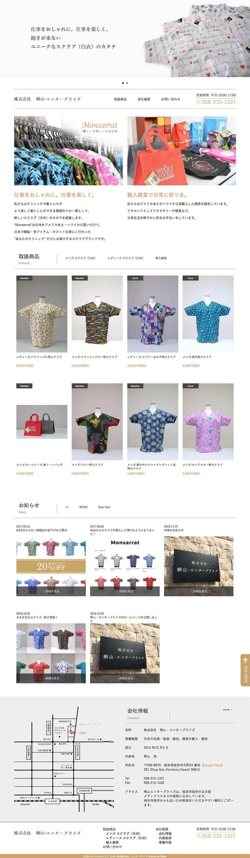 株式会社桐山・エンタープライズ様は、「オリジナルスクラブ(白衣)」の企画・製造・販売および輸入雑貨の販売を行っておられ、クリニックで働く方々が楽しく働くことができる環境作りの一環として、新しいスクラブ(白衣)のカタチをご提案されていらっしゃいます。